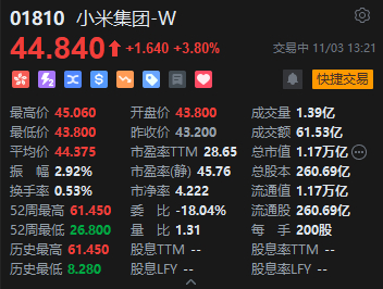 11月3日消息,小米集团午后涨幅扩大至超4%,报45.06港元。截至发文,小米集团涨3.8%,成交额逾61亿港元。