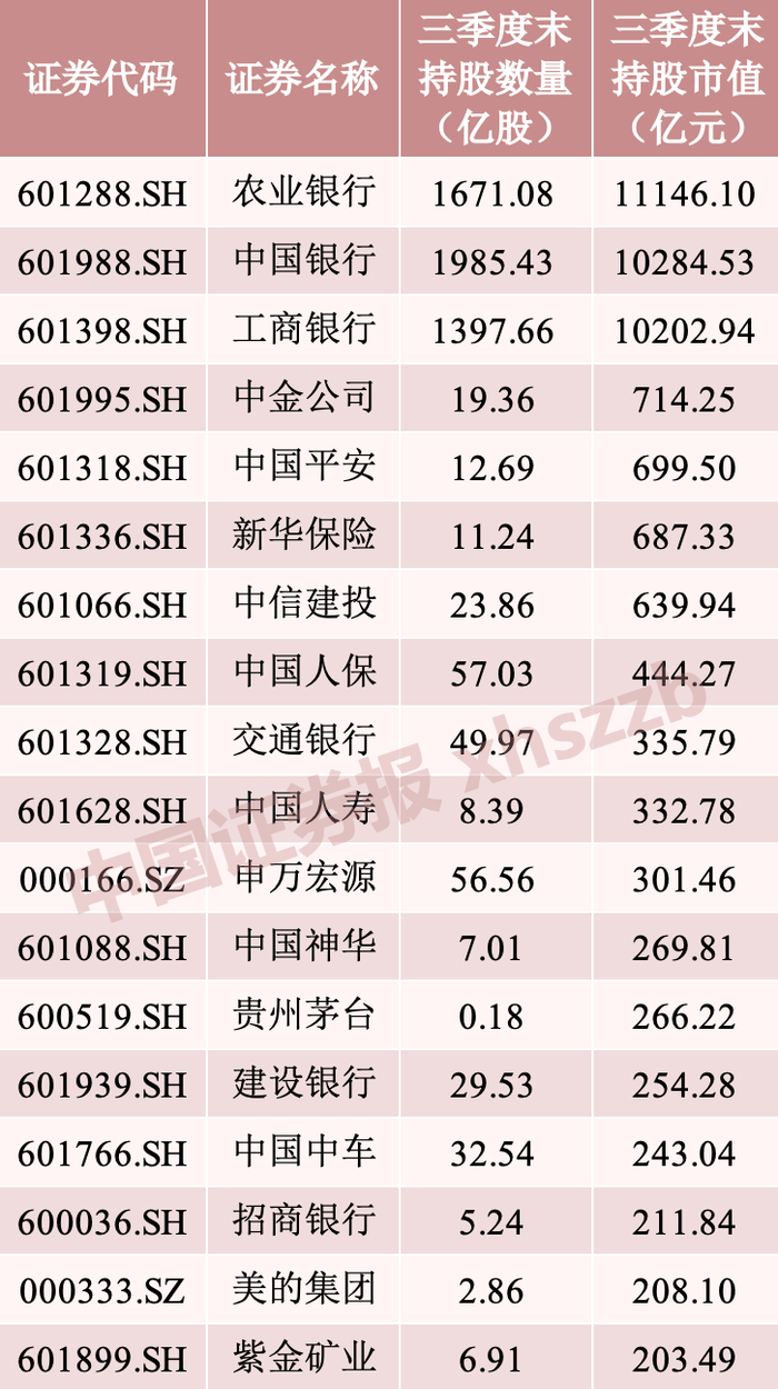 “国家队”资金三季度末持股情况