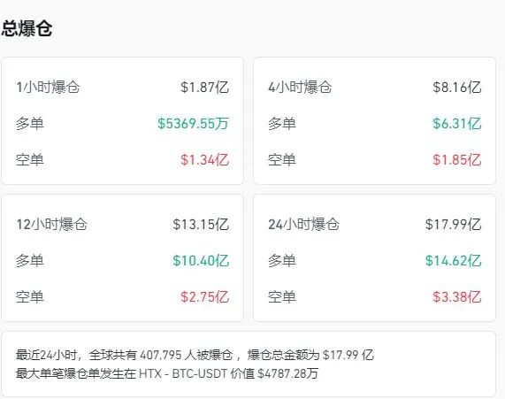 数据显示24小时,共有超40万人爆仓,17.99亿美元(约合人民币128亿元)蒸发。