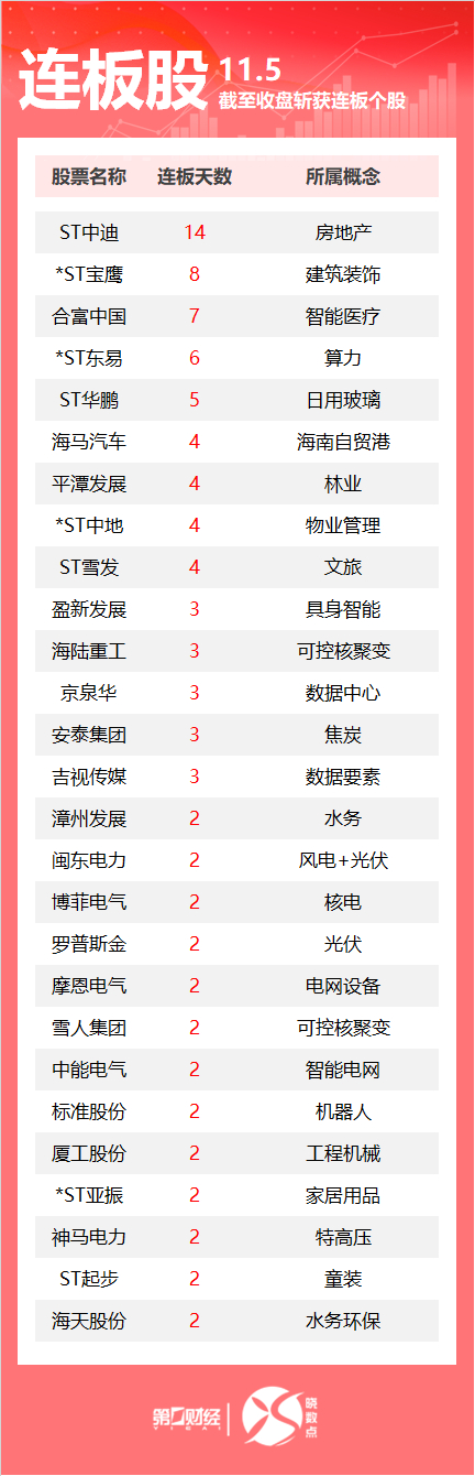 11月5日,Wind数据显示,A股市场共计83只个股涨停。其中医疗股合富中国收获7连板,可控核聚变股海陆重工3连板。一图速览今日连板股>>