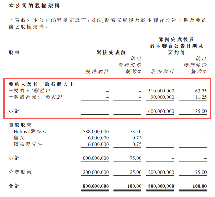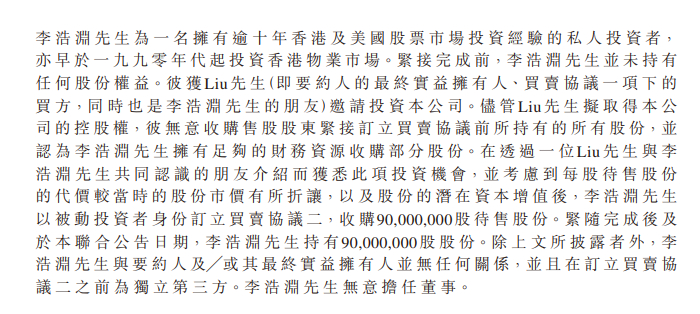随着交易于上周完成,Liu Chuang、李浩渊各持有公司的63.75%、11.25%股权。每股收购价较上周四停牌前收市价0.95港元,折让约74.3%。