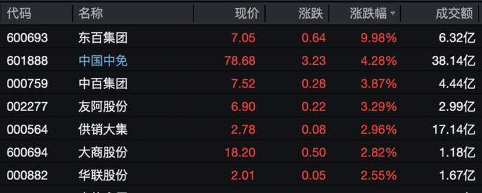 商贸零售板块亦表现强势,东百集团涨停,中国中免、中百集团、供销大集等股票跟涨。