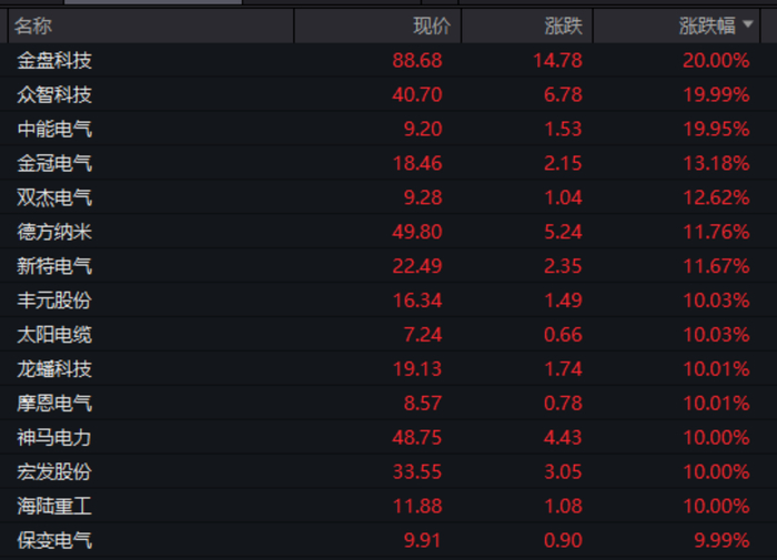 行业板块和赛道方面,若按照申万一级行业划分,电力设备板块领涨,金盘科技、众智科技、中能电气“20cm”涨停;金冠电气、双杰电气、德方纳米、新特电气等股票涨幅超过10%。另外,丰元股份、太阳电缆、龙蟠科技、摩恩电气、海陆重工、神马电力、保变电气、特变电工、新能泰山等多股涨停。