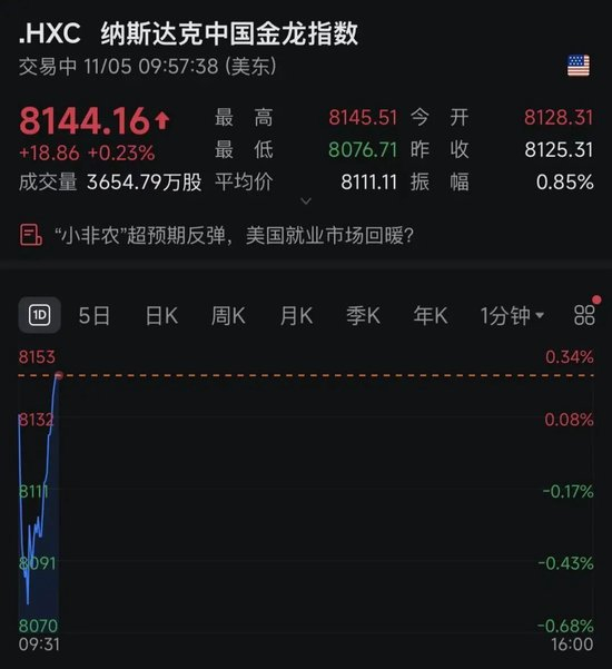 中概股方面,纳斯达克中国金龙指数也直线拉升,个股方面,阿特斯太阳能涨逾13%,新氧涨超7%。