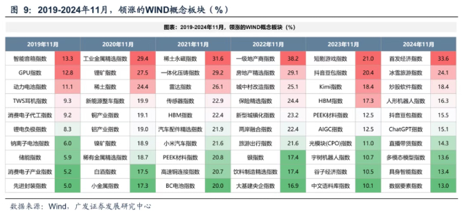 “但11月的市场也并非简单防御,而是呈现比较明显的题材板块特征。比如2024年11月产业消息面催化的AI应用、机器人行情;2022年11月地产融资优化带来的地产链行情;2020年11月宏观数据持续改善驱动低估的周期板块走强;2019年5G建设、苹果无线耳机、新能源汽车规划也带动相关概念板块有不错的表现。”