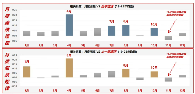 “从过往经验来看,每年11月市场涨跌与基本面相关性最弱,甚至呈现一定的负相关性;且不论是以当季业绩(四季度)或上一季业绩(三季度)为基准,都如此。”广发证券表示。