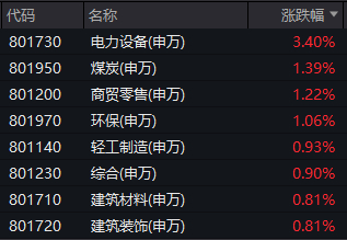 Wind数据显示,申万一级行业分类下,11月5日电力设备涨幅居前,上涨3.4%;煤炭、商贸零售、环保等板块均涨超1%,轻工制造、综合、建筑材料、建筑装饰等同样涨幅居前。