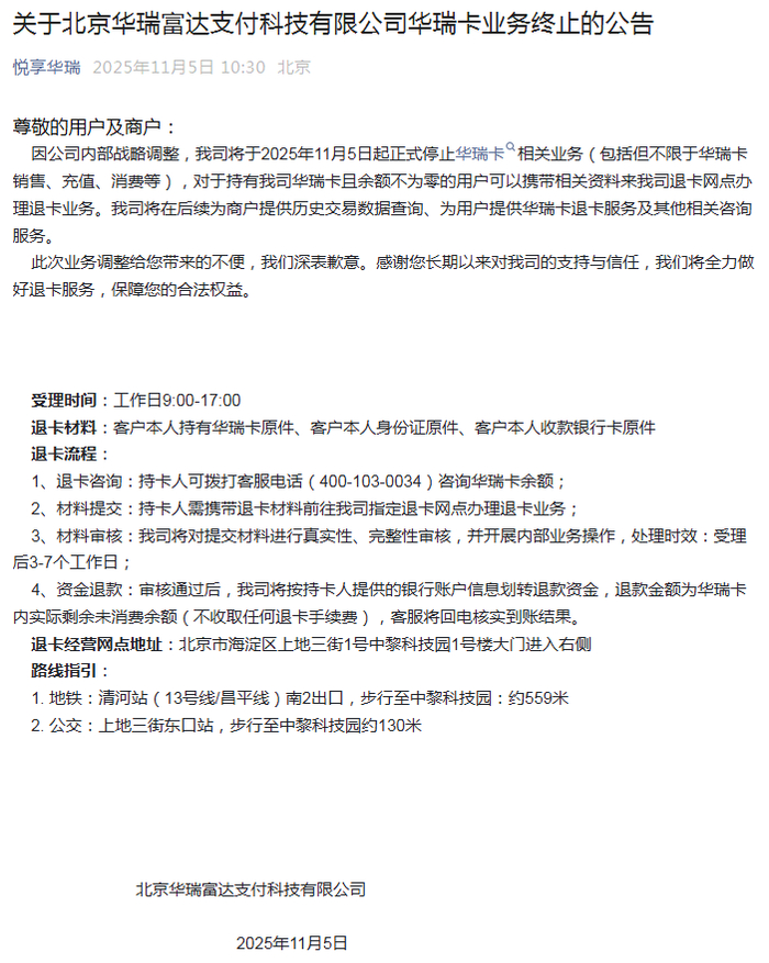 华瑞富达表示,因公司内部战略调整,我司将于2025年11月5日起正式停止华瑞卡相关业务(包括但不限于华瑞卡销售、充值、消费等),对于持有我司华瑞卡且余额不为零的用户可以携带相关资料来我司退卡网点办理退卡业务。