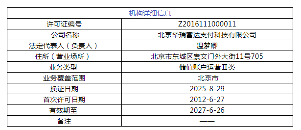 华瑞富达成立于2007年,于2012年获得预付卡发行与受理牌照,2024年换证后,业务类型变更为储值账户运营Ⅱ类,有效期至2027年6月26日。