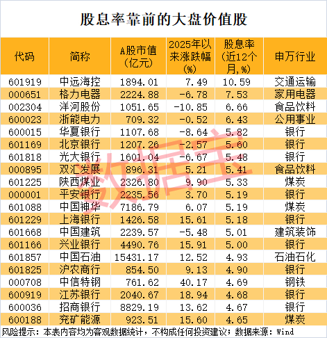 高股息是衡量上市公司价值的重要因素之一。据数据宝统计,截至11月5日收盘,大盘价值股的股息率(近12个月)均值达到4.05%,远高于同期A股整体水平。13股的股息率超过5%,如中远海控、格力电器、洋河股份、浙能电力、华夏银行等。中远海控股息率最高,达到10.59%。