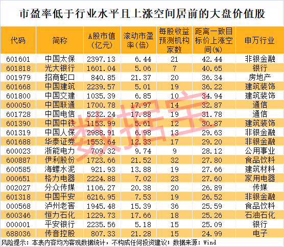 53只大盘价值股市盈率低于行业水平