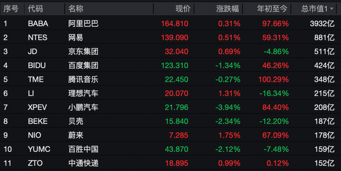 个股方面,富途控股涨超4%,唯品会、好未来涨超2%,理想汽车、蔚来、霸王茶姬涨超1%,京东、阿里巴巴等小幅上涨;而新东方、小鹏汽车跌逾3%,贝壳跌超2%,百度跌逾1%,腾讯音乐、哔哩哔哩小幅下跌。