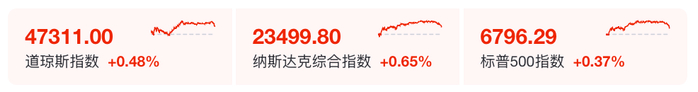 在经历早盘窄幅震荡后,美股午后逐步走强。截至收盘,道指上涨0.48%,报47311.0点;标普500指数涨0.37%,报6796.29点;纳指涨0.65%,报23499.8点。