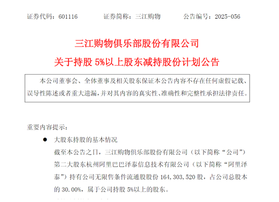 据披露,此次阿里泽泰拟通过集中竞价减持不超过547.68万股,通过大宗交易减持不超过1095.36万股。目前,阿里泽泰持有三江购物无限售条件流通股股份1.64亿股,占公司总股本的30%,属于公司持股5%以上的股东。