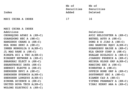 除MSCI中国指数以外,MSCI中国A股在岸指数的成分股名单也有所调整中增加成分股17只,剔除16只。增加的股票有千里科技、东阳光、长川科技、华虹公司、中材科技等。