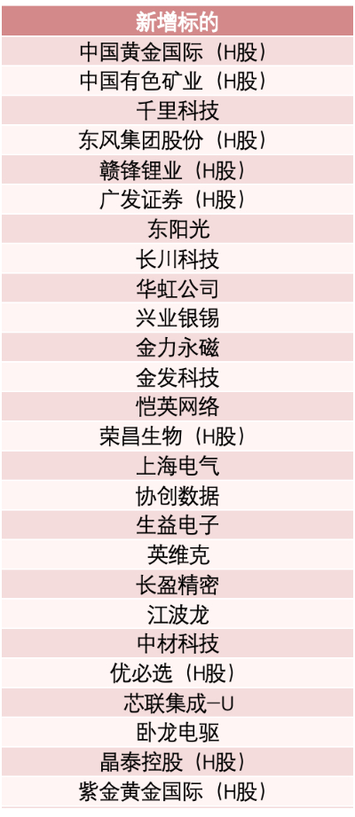 在中国公司方面,MSCI中国指数本次新增26只标的,包括多只资源股,以及半导体、高端制造等科技类公司,例如:中国黄金国际(H股)、紫金黄金国际(H股)、中国有色矿业(H股)、赣锋锂业(H股)、华虹公司、生益电子、英维克、长盈精密、江波龙、中材科技、优必选(H股)等。
