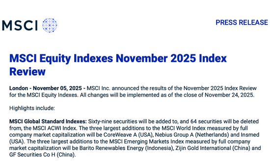 按公司市值计算,MSCI发达市场指数新增的三大个股为CoreWeave、Nebius和Insmed;MSCI新兴市场指数新增的三大个股是Barito Renewables Energy、紫金黄金国际(H股)和广发证券(H股)。