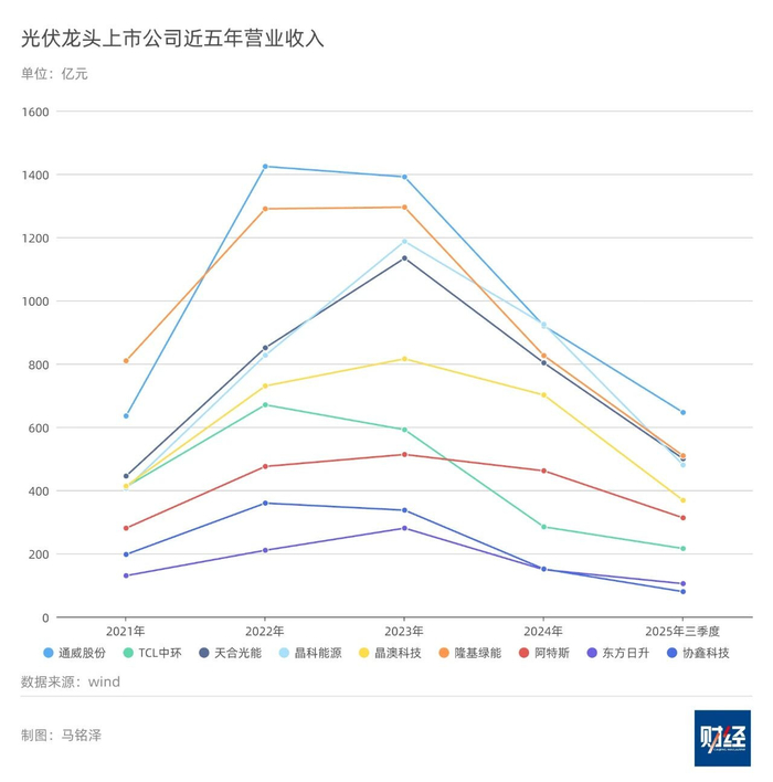 光伏制造业近两年全线亏损。2024年,龙头企业里仅阿特斯和晶科能源有微薄利润,其余企业皆亏损;2025年前三季度,除了阿特斯继续保持盈利、协鑫科技止亏,其他龙头企业都陷入亏损。