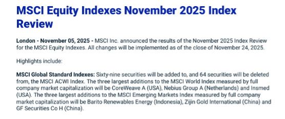 北京时间11月6日早间,国际指数编制公司MSCI公布了11月指数审核变更结果。在本次调整中,MSCI中国A股指数新纳入17只标的,剔除16只。本次调整结果将于2025年11月24日收盘后生效。