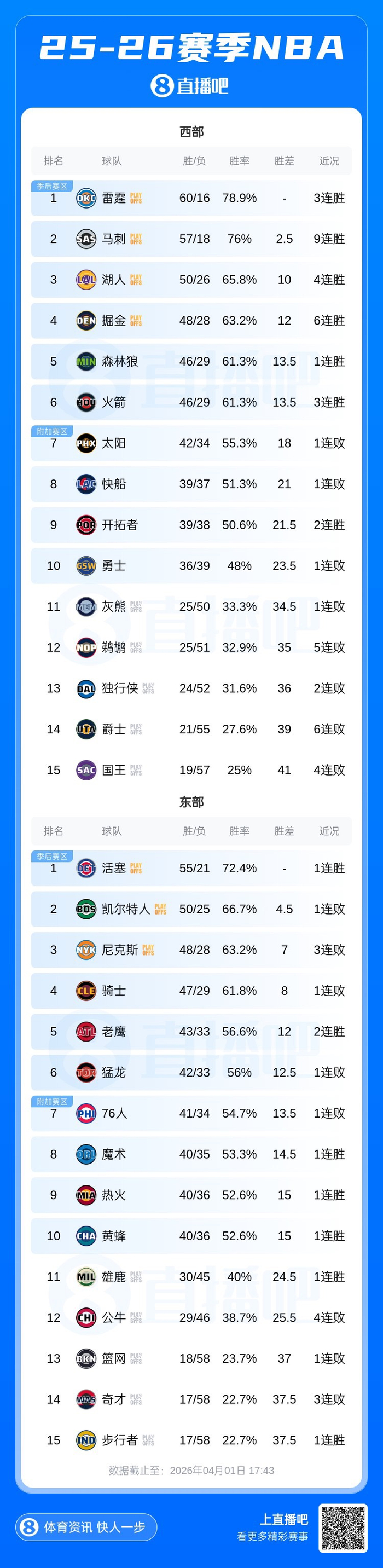 目前,西部前六都在赢球——雷霆(60胜16负)3连胜、马刺(57胜18负)9连胜、湖人(50胜26负)4连胜、掘金(48胜28负)6连胜、森林狼(46胜29负)、火箭(46胜29负)3连胜。